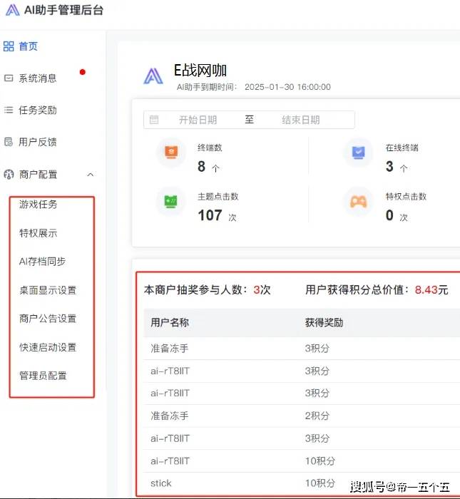 新增了AI帮手《商家后台》店内开机红包参取人数以及店内加入人员获得实物和积分和Q币的明细和记实。